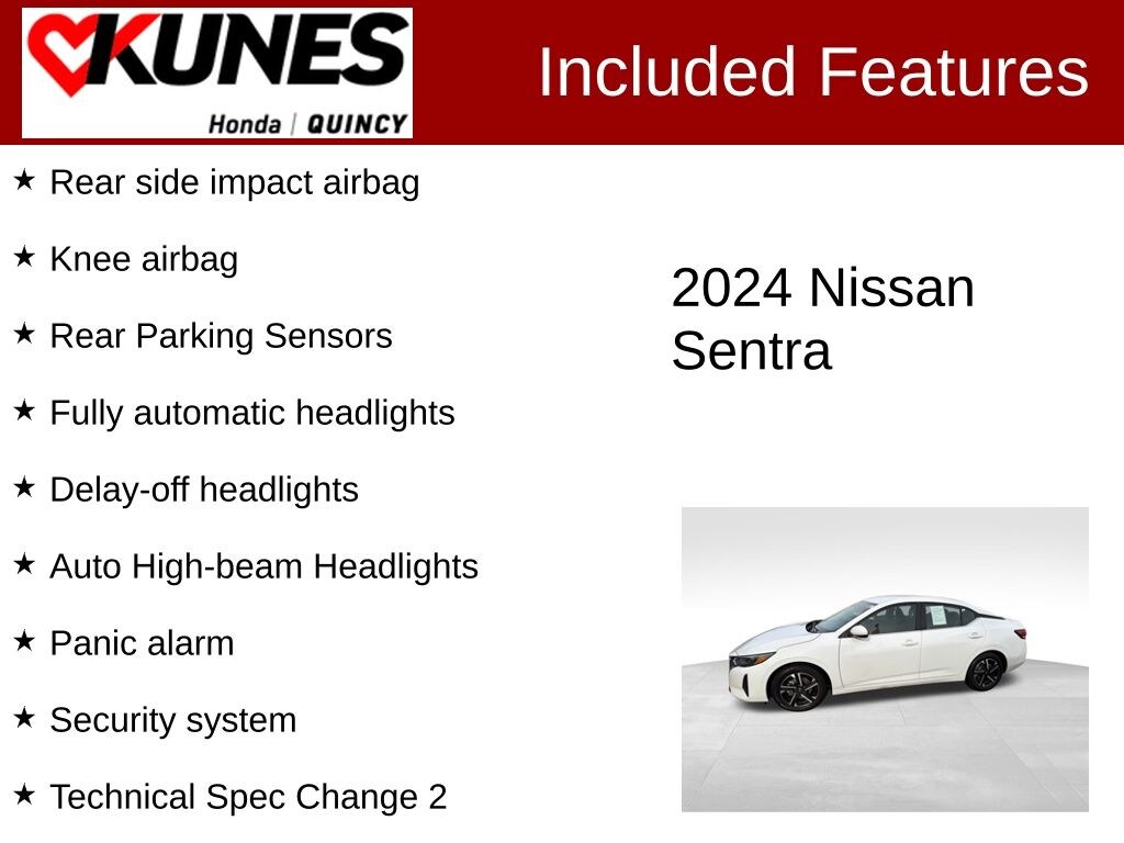 CARFAX One-Owner. Clean CARFAX. Fresh Powder 2024 Nissan Sentra SV FWD CVT with Xtronic 2.0L I4 DOHC ADVANCED SAFETY Tech, BACKUP CAMERA, SIRIUSXM RADIO, BLUETOOTH, APPLE CAR PLAY/ ANDROID AUTO, CVT with Xtronic, Charcoal Cloth, Auto High-beam Headlights, Delay-off headlights, Fully automatic headlights, Knee airbag, Leather steering wheel, Panic alarm, Rear Parking Sensors, Rear side impact airbag, Security system, Technical Spec Change 2. 30/40 City/Highway MPG