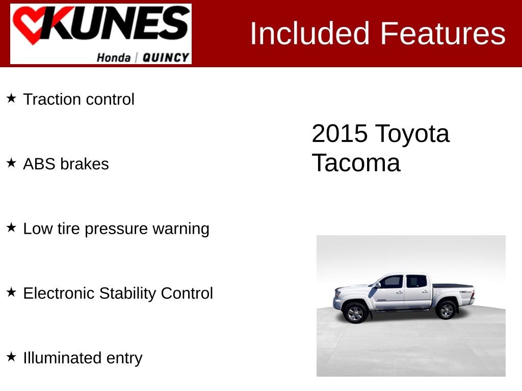 Clean CARFAX. White 2015 Toyota Tacoma 4WD 5-Speed Automatic 4.0L V6 EFI DOHC 24V 4WD, ABS brakes, Electronic Stability Control, Illuminated entry, Low tire pressure warning, Traction control.