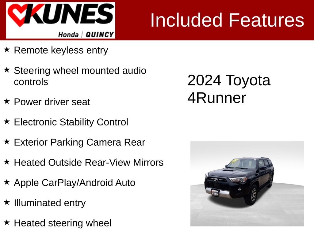 CARFAX One-Owner. Clean CARFAX. Black 2024 Toyota 4Runner TRD Off-Road Premium 4WD 5-Speed with ECT 4.0L V6 DOHC 24V NAVIGATION, APPLE CAR PLAY/ ANDROID AUTO, HARD TO FIND!!, 4WD, Black/Graphite w/Leather Seat Trim, Apple CarPlay/Android Auto, Electronic Stability Control, Exterior Parking Camera Rear, Heated Outside Rear-View Mirrors, Heated steering wheel, Illuminated entry, Power driver seat, Remote keyless entry, SofTex Seat Trim, Steering wheel mounted audio controls, Wheels: 17" Unique 7-Spoke Off-Road Alloy.
